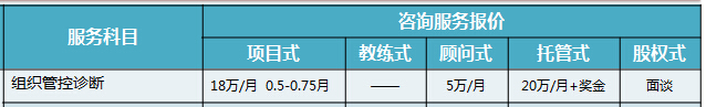 务牛组织管理与流程咨询中心根据企业实际和咨询市场需要,推出项目式、顾问式、股权式等服务模式,相应模式的报价信息见下图。关注最新全面报价详本站服务报价栏目,如有疑问欢迎致电136 7163 9717或者在线咨询,在线咨询可点击本页面折叠的客服中心中联系相应客服进行咨询。